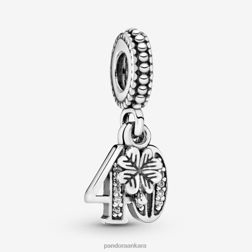 40. yıldönümünü veya yaramaz kırkıncı doğum gününü kutlamak için yapılan pandora anları için bu saf gümüş sarkan charm bilezikler, kübik zirkon ve boncuklu ayrıntılarla vurgulanmıştır. takan kişiye şans getirmesi için dört yapraklı minyatür bir yonca sallantısıyla tamamlanmıştır.